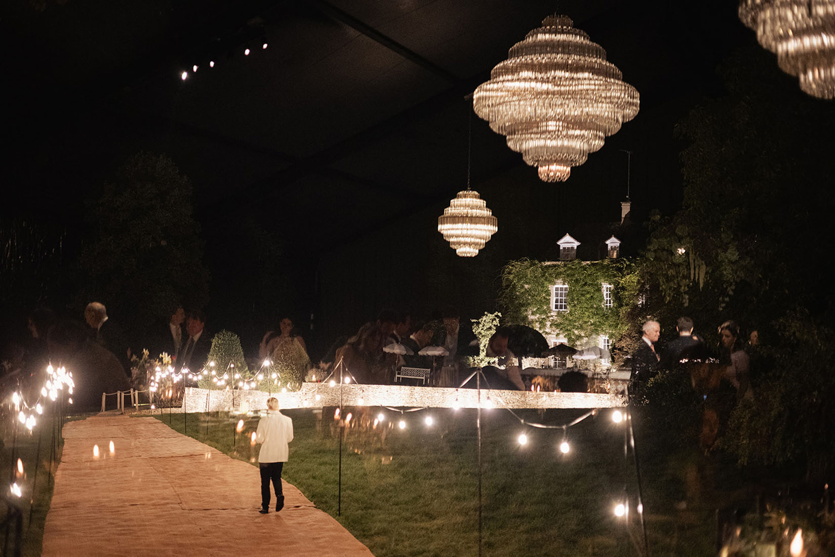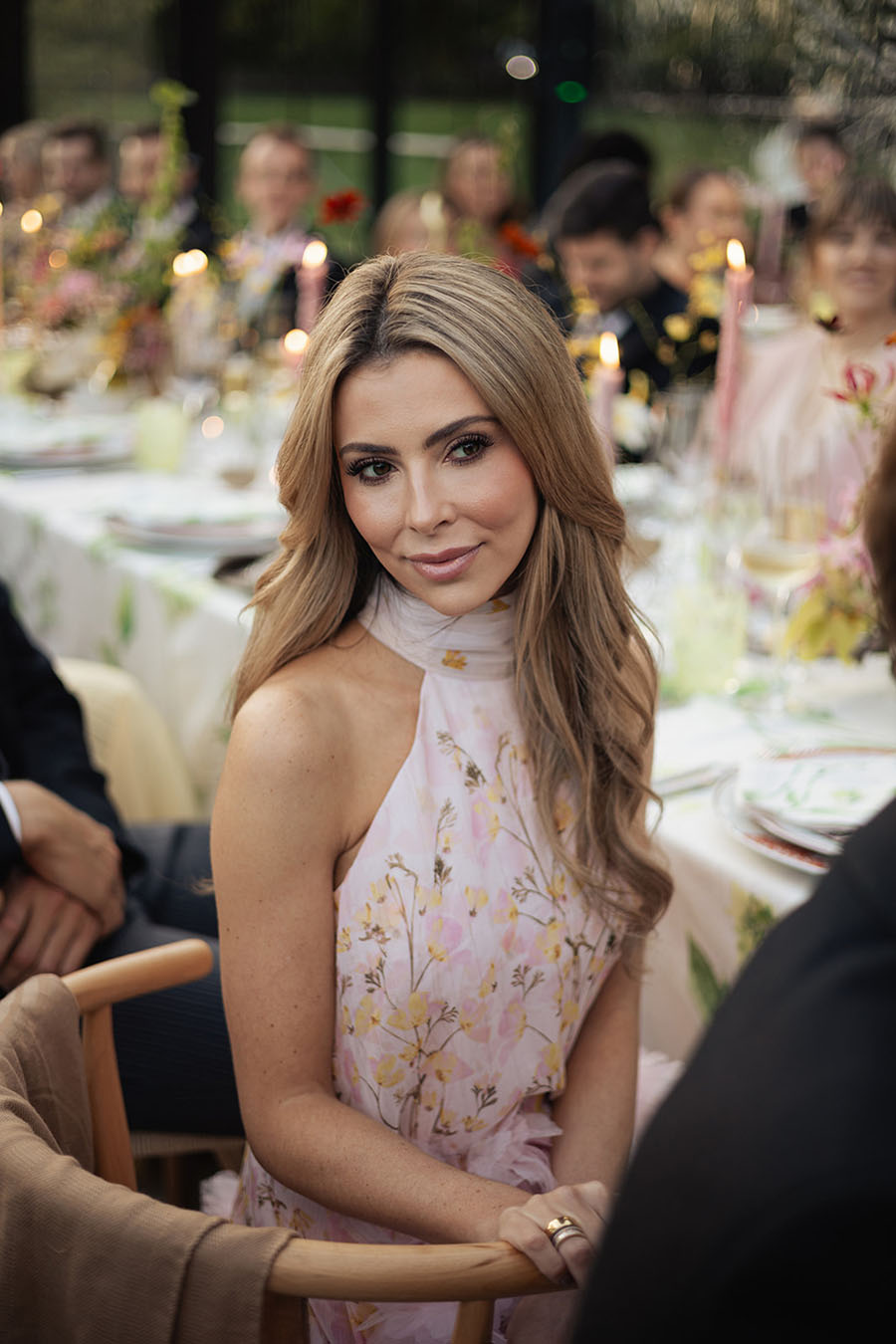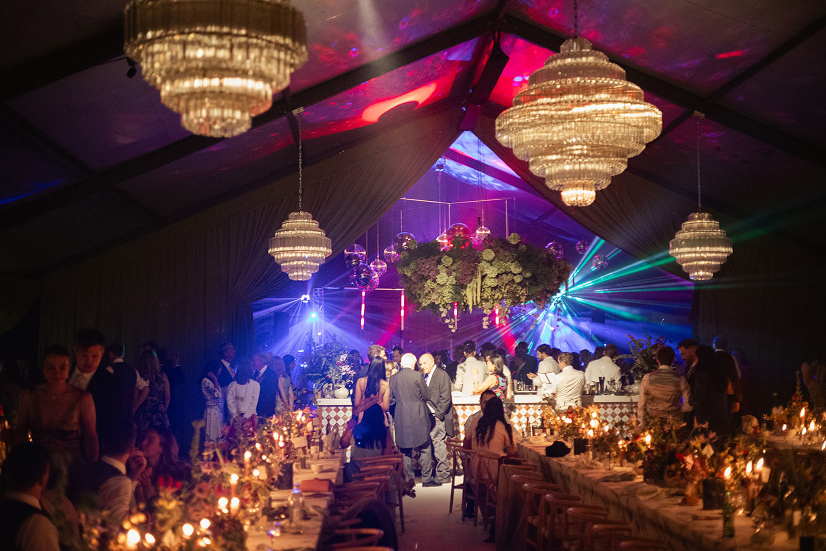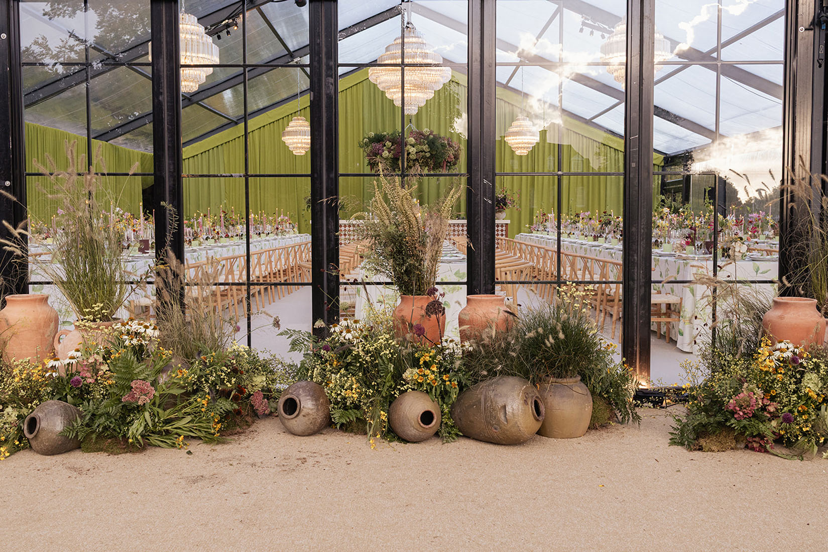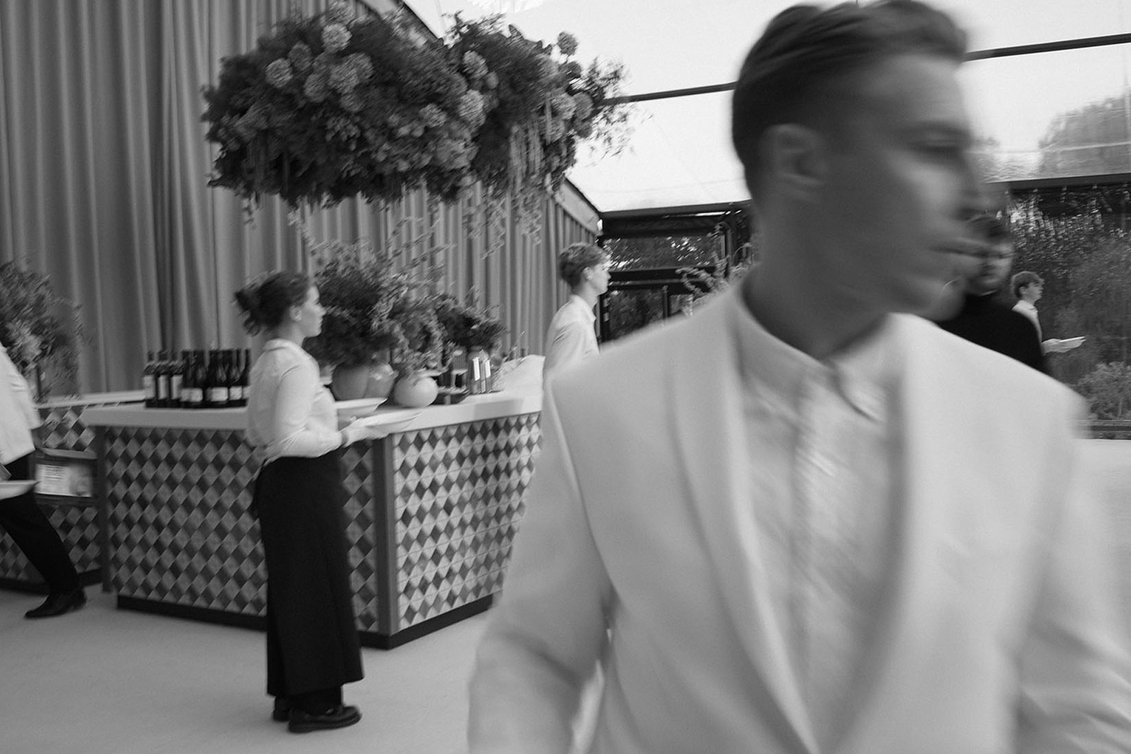 Cocktails and canapés followed in the gardens, before guests moved through to a purpose-built black-framed marquee, a study in layered design and atmosphere. Inside, the tone was vibrant yet restrained: