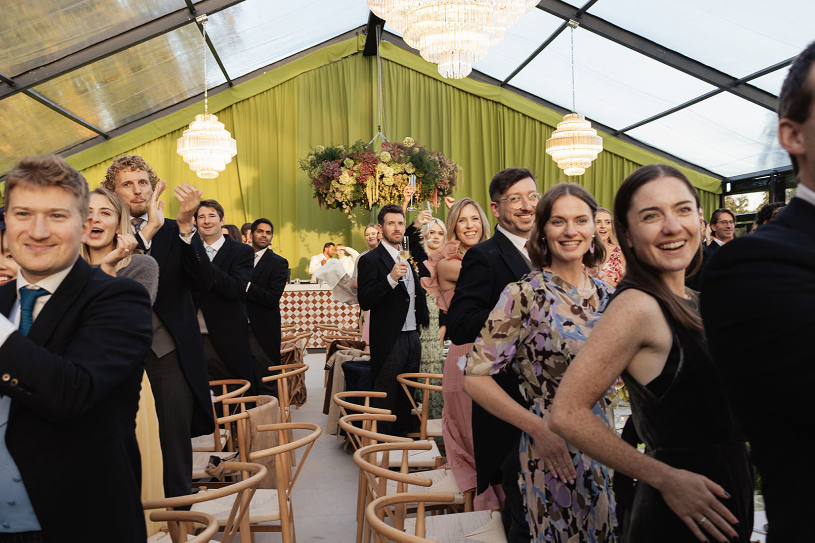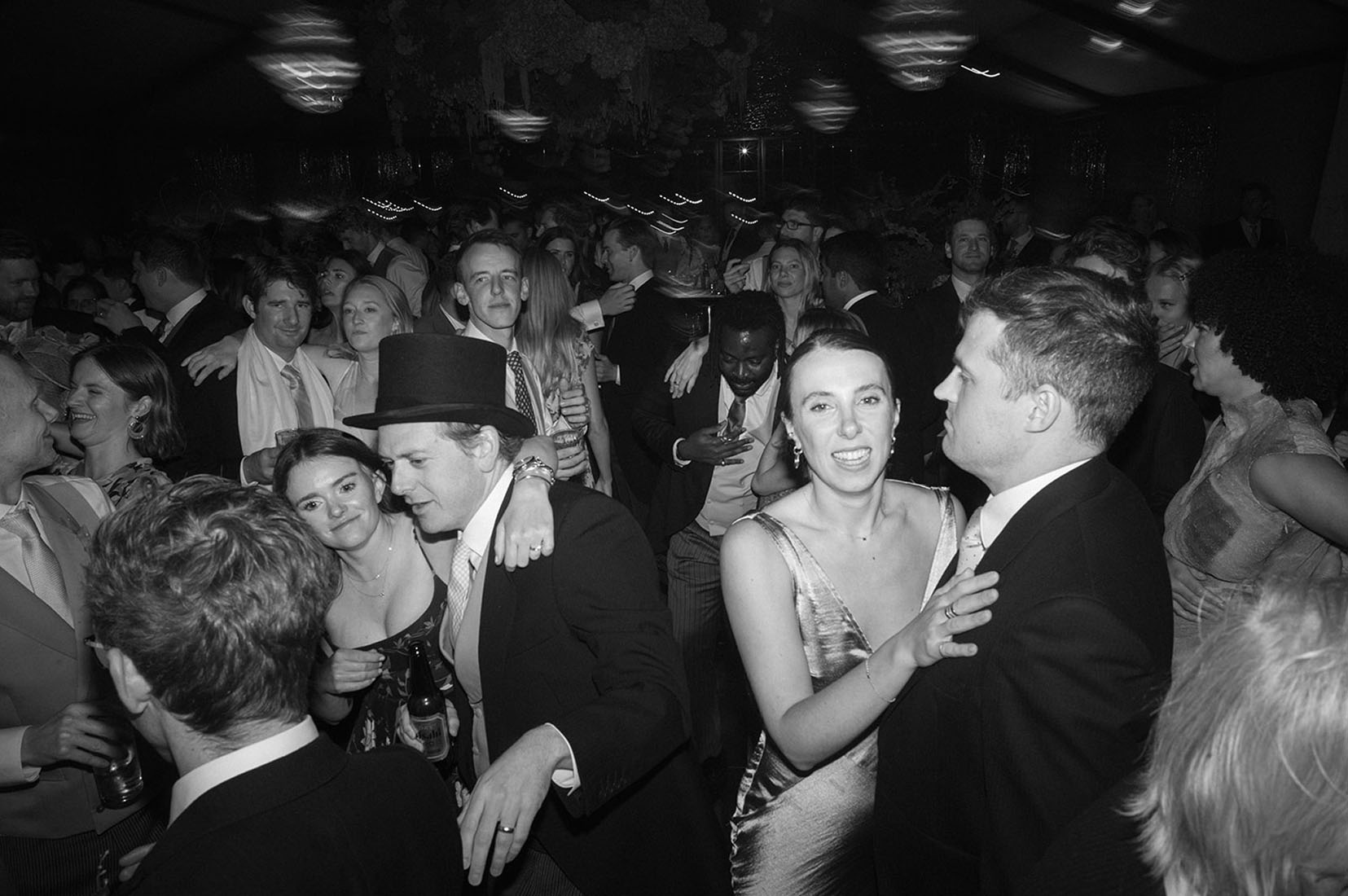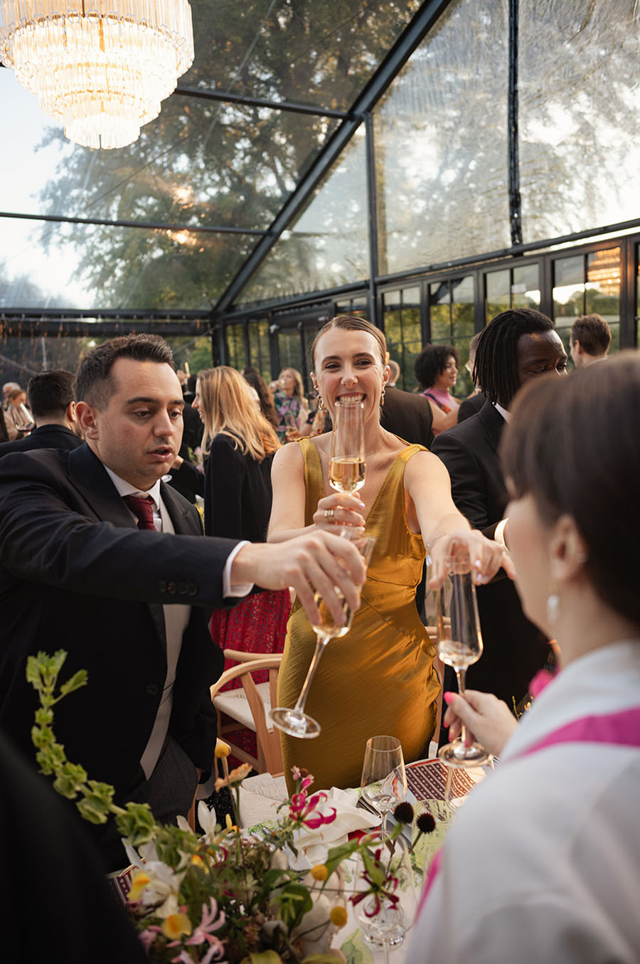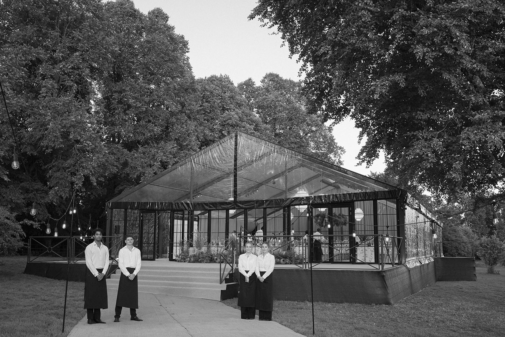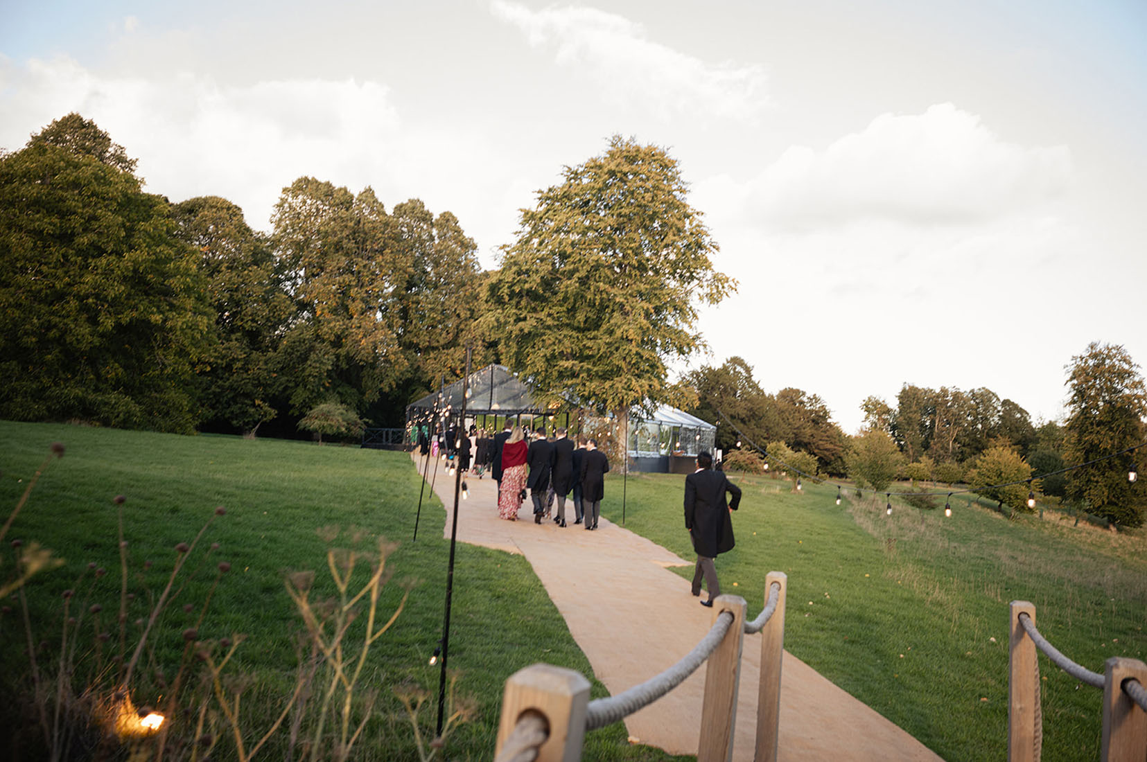 Cocktails and canapés followed in the gardens, before guests moved through to a purpose-built black-framed marquee, a study in layered design and atmosphere. Inside, the tone was vibrant yet restrained: