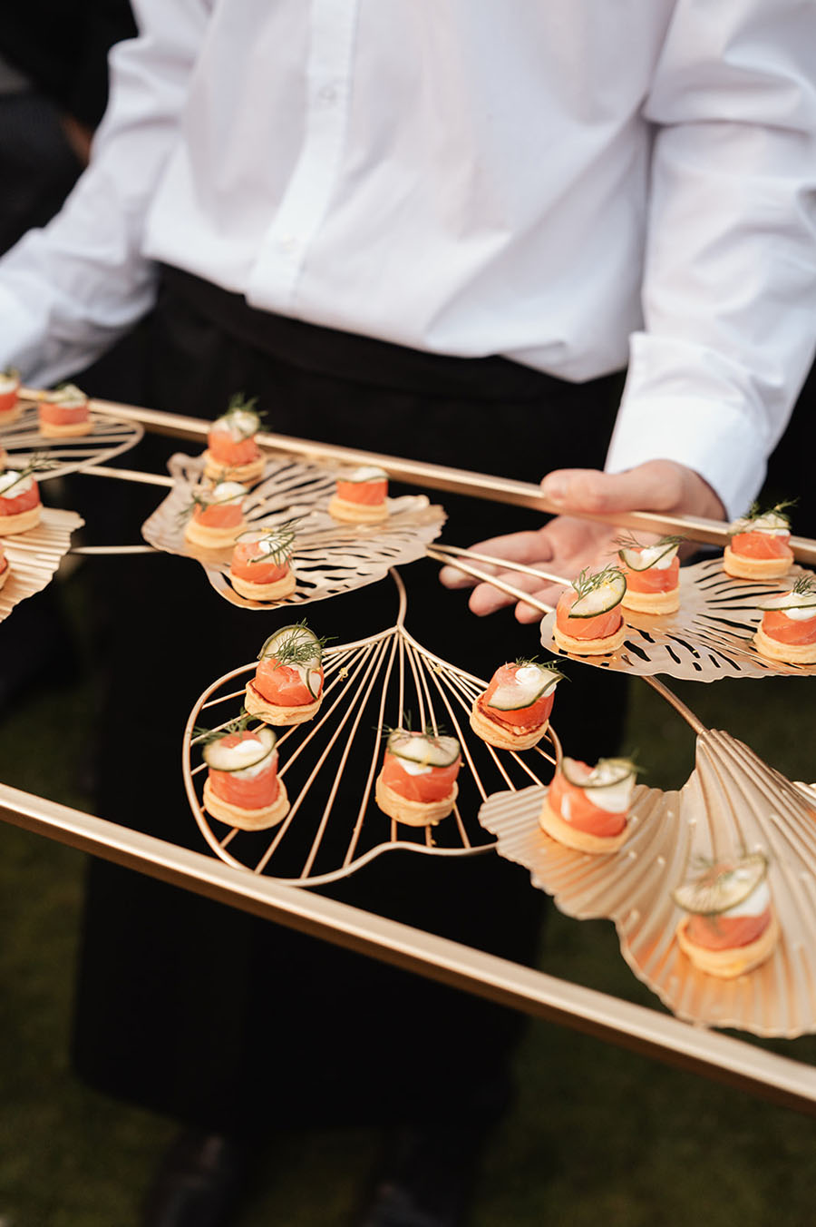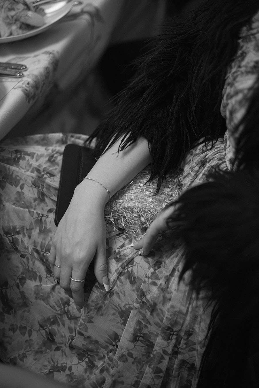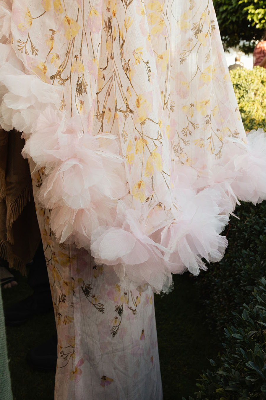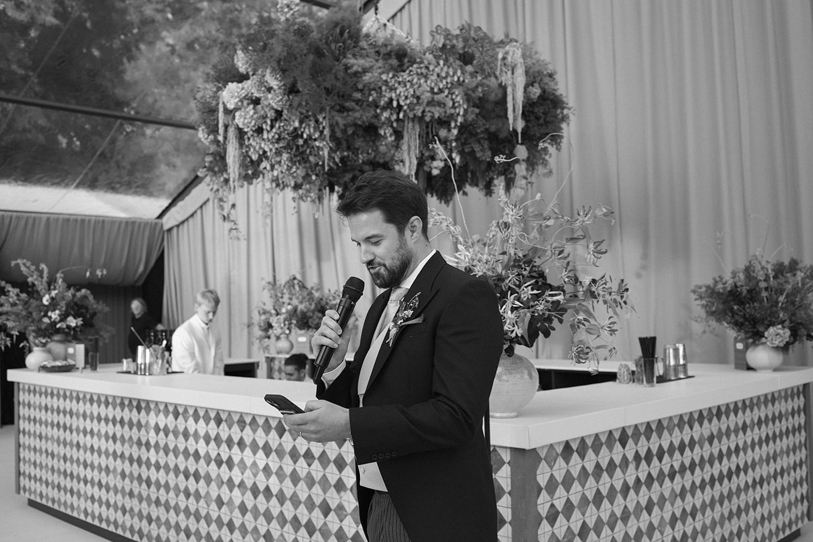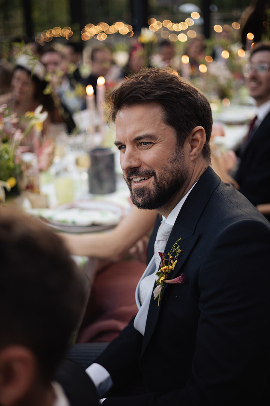 Cocktails and canapés followed in the gardens, before guests moved through to a purpose-built black-framed marquee, a study in layered design and atmosphere. Inside, the tone was vibrant yet restrained: