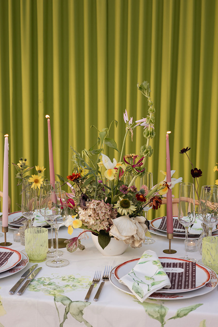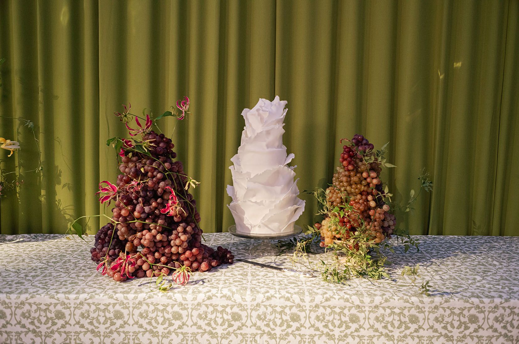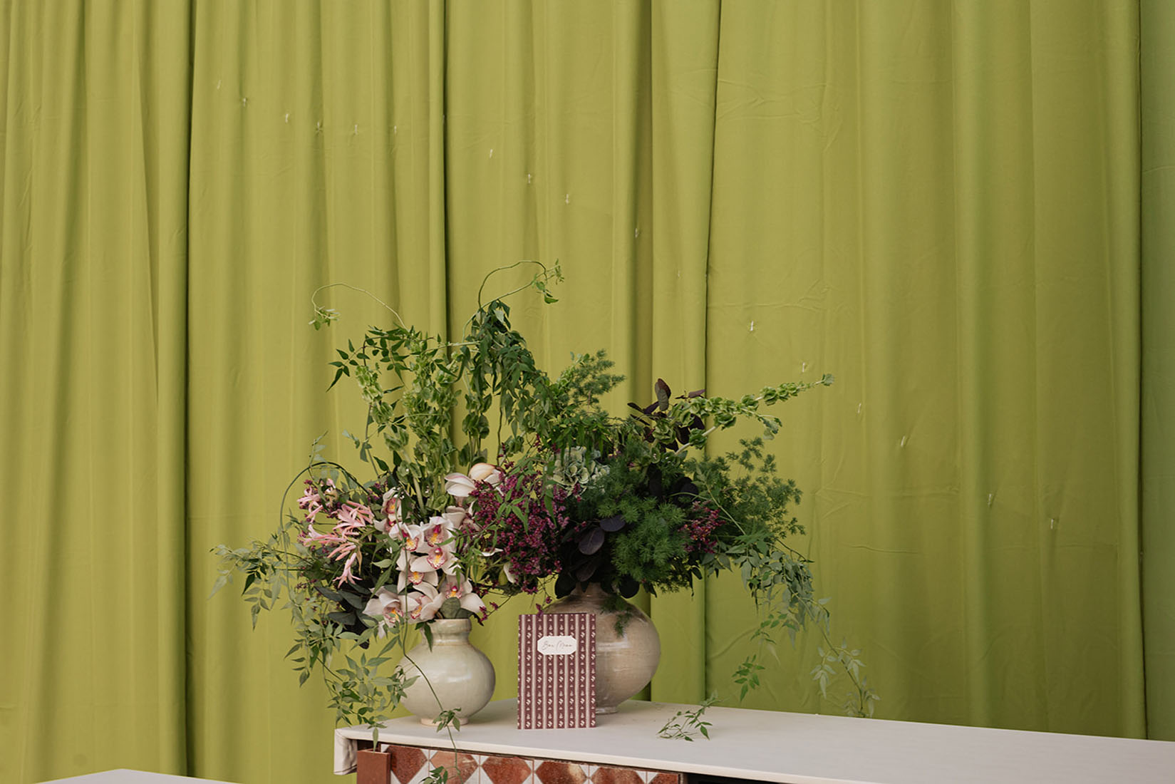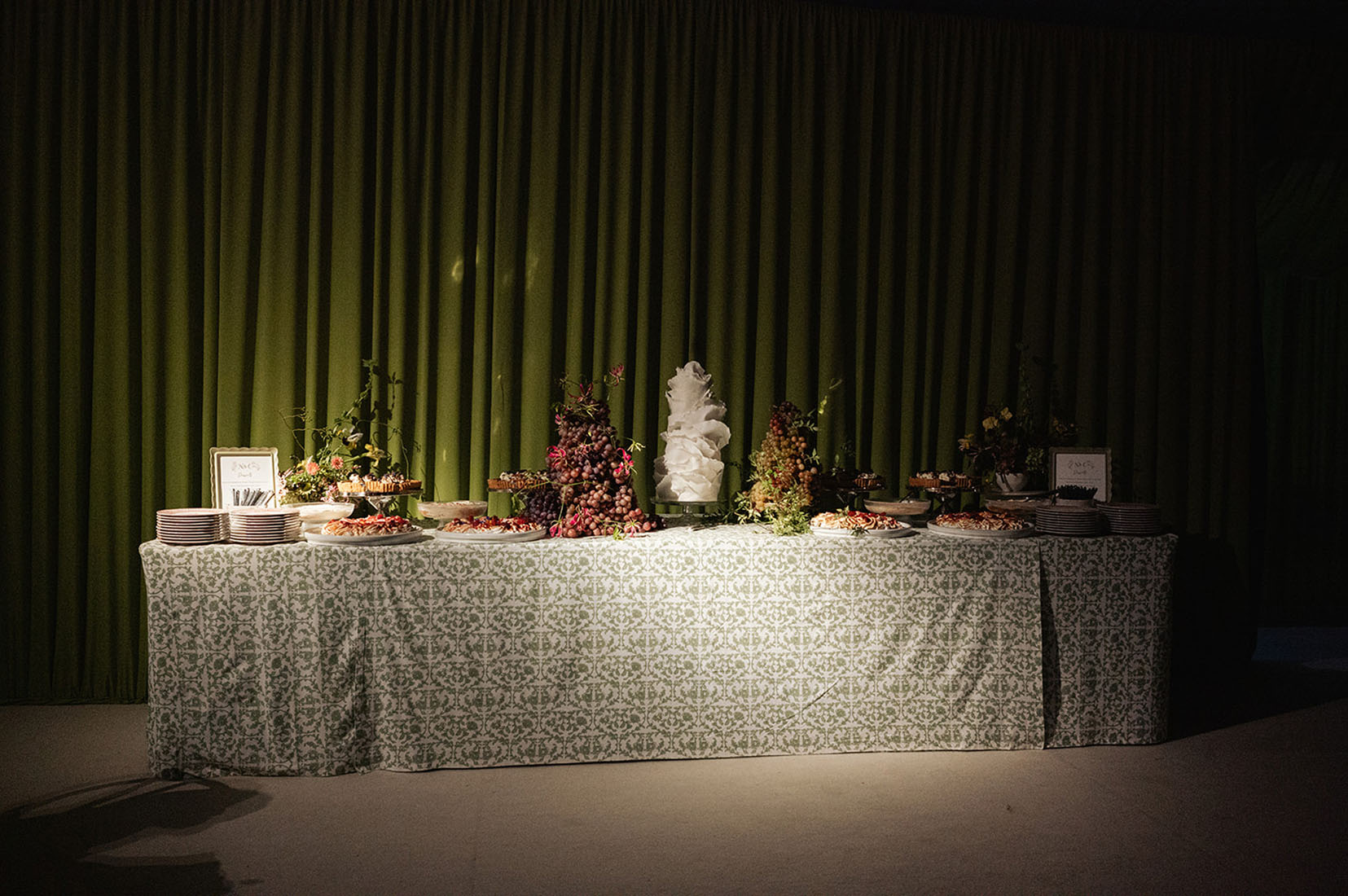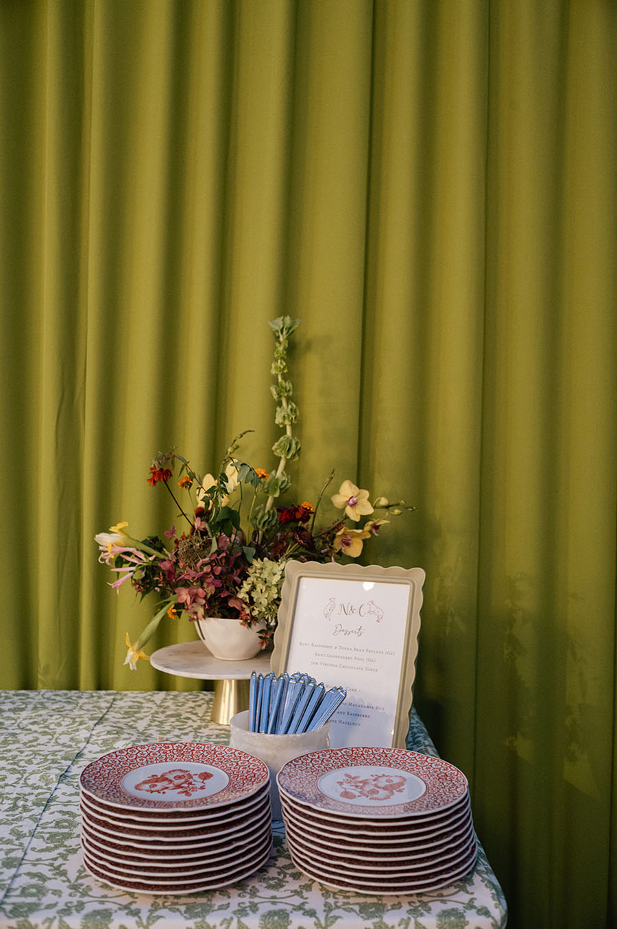 The backdrop, a statement olive-chartreuse drape, added a bold, joyful pop that transformed the space from “wedding” to “stylish pop-up restaurant.”
