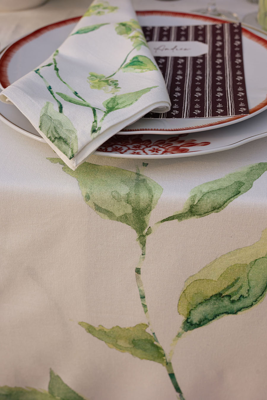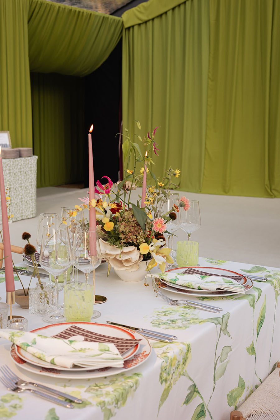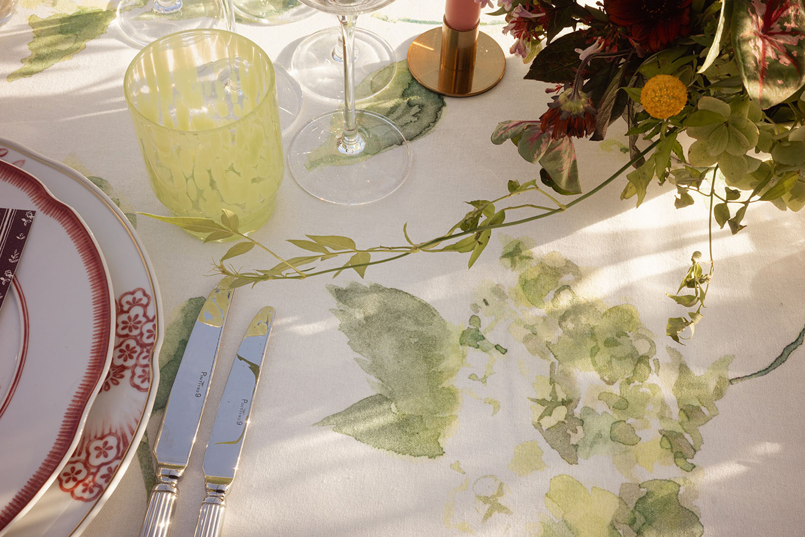Hand-painted linens by Maison Margaux in soft greens and white brought warmth and whimsy.