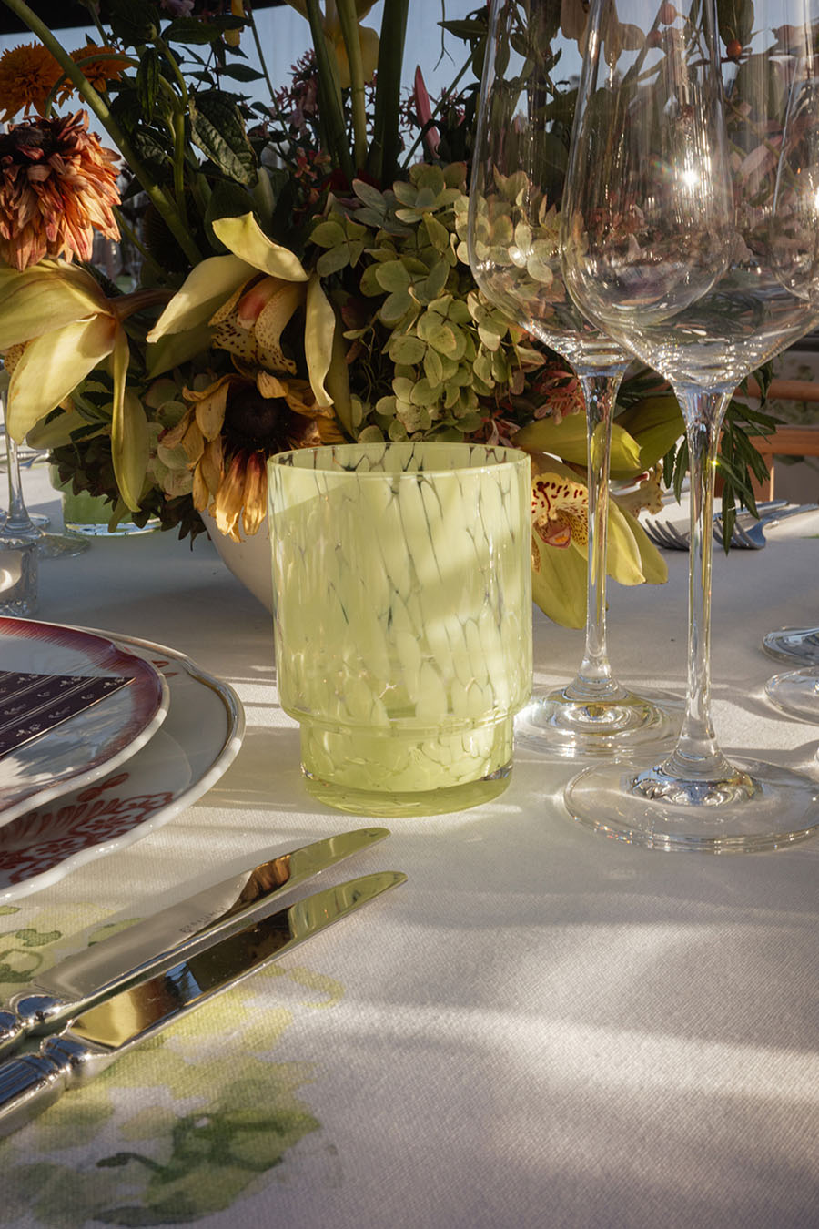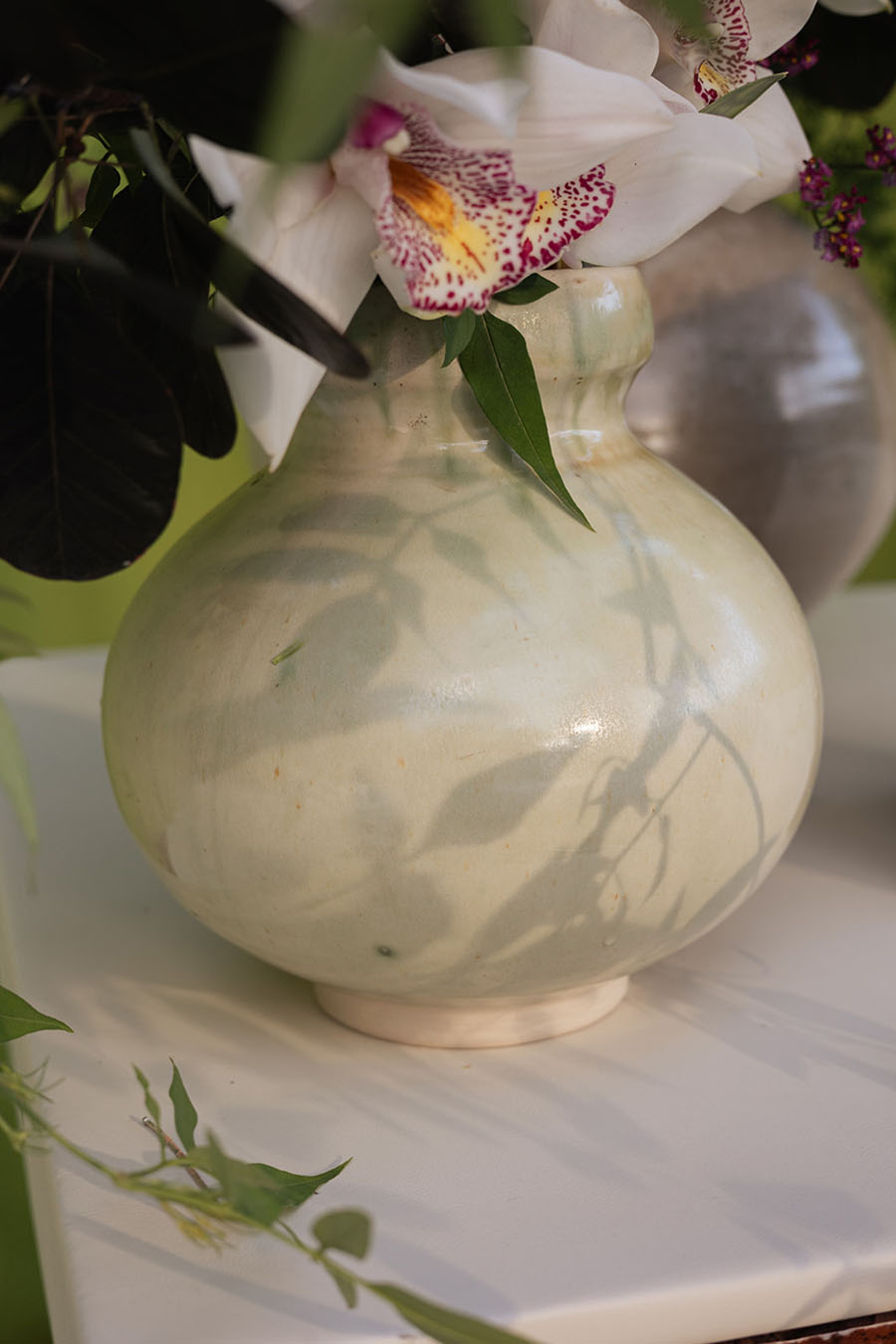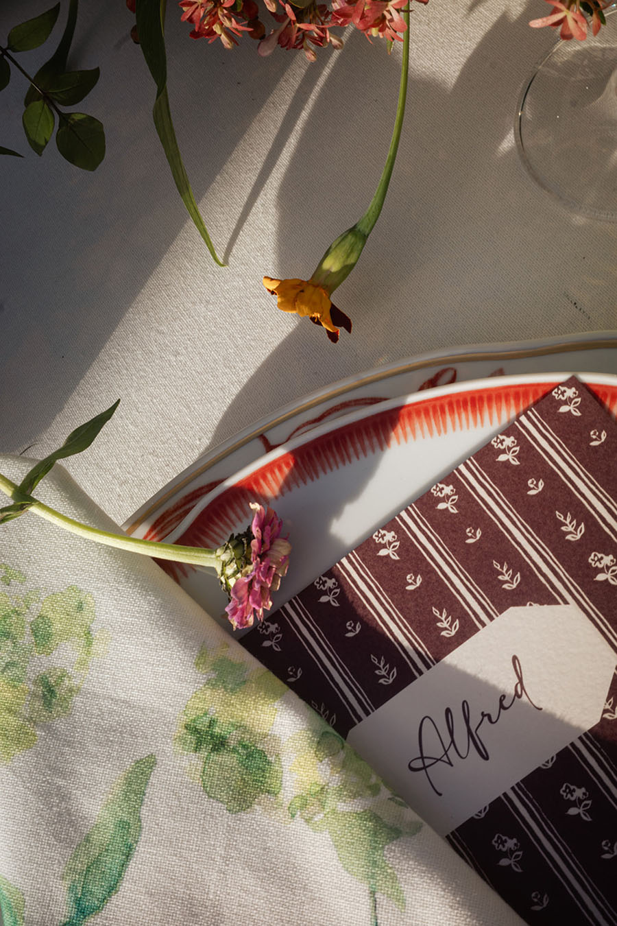 Hand-painted linens by Maison Margaux in soft greens and white brought warmth and whimsy.