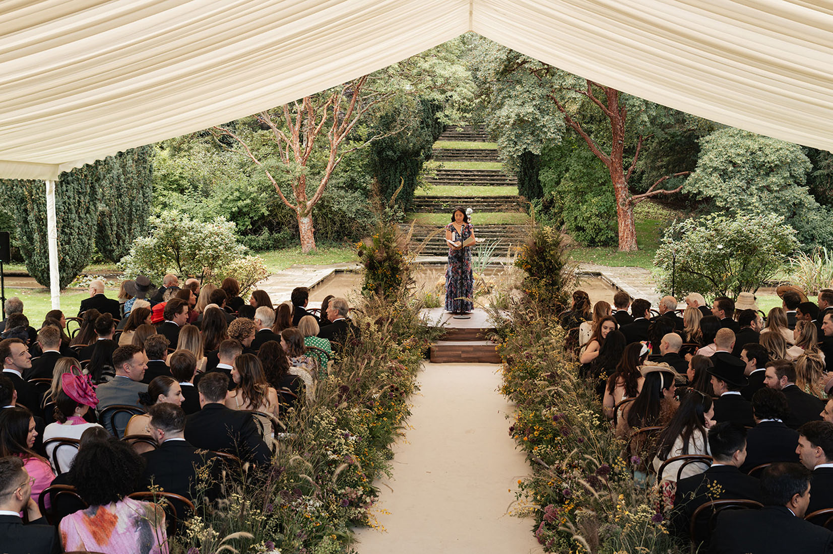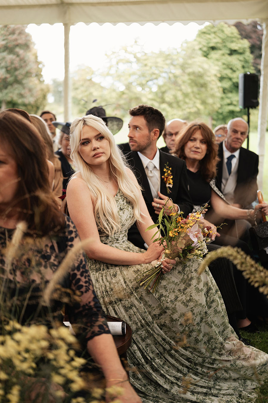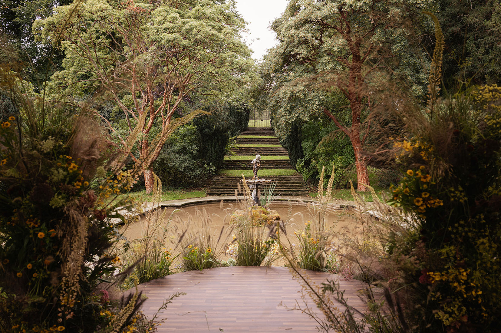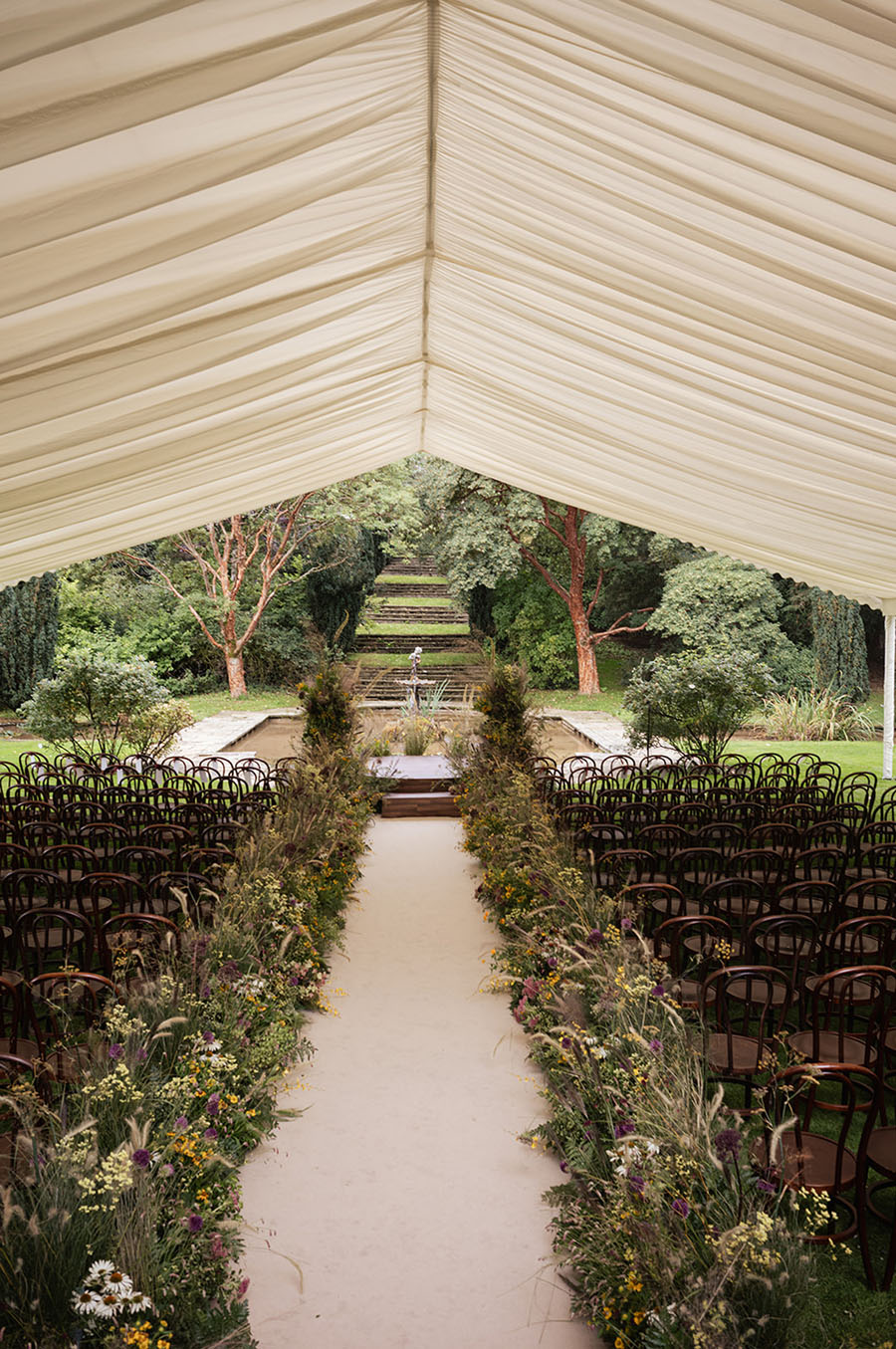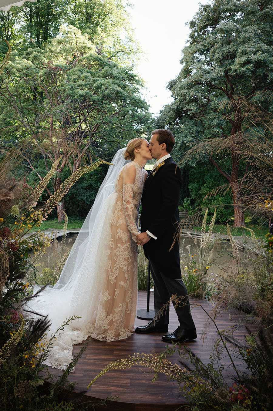 On Saturday, anticipation built through a morning of excitement and laughter as the couple prepared with their nearest and dearest. The ceremony took place in the water garden, framed by the estate’s elegant fountain and tree-lined canals. Beneath a soft, tented canopy, guests watched as the couple exchanged vows on a handcrafted wooden stage, surrounded by wildflower meadows that blurred seamlessly into the landscape beyond.