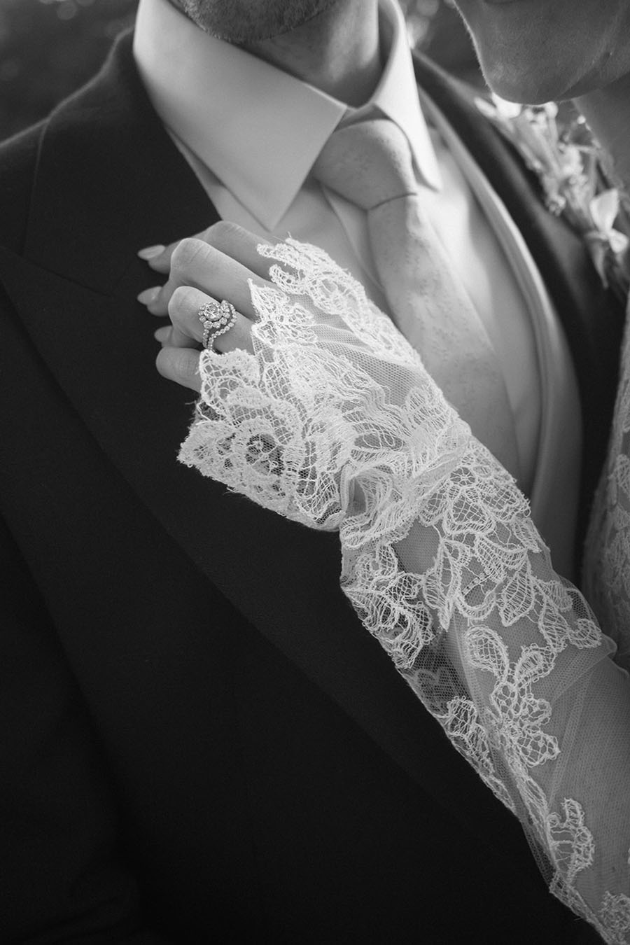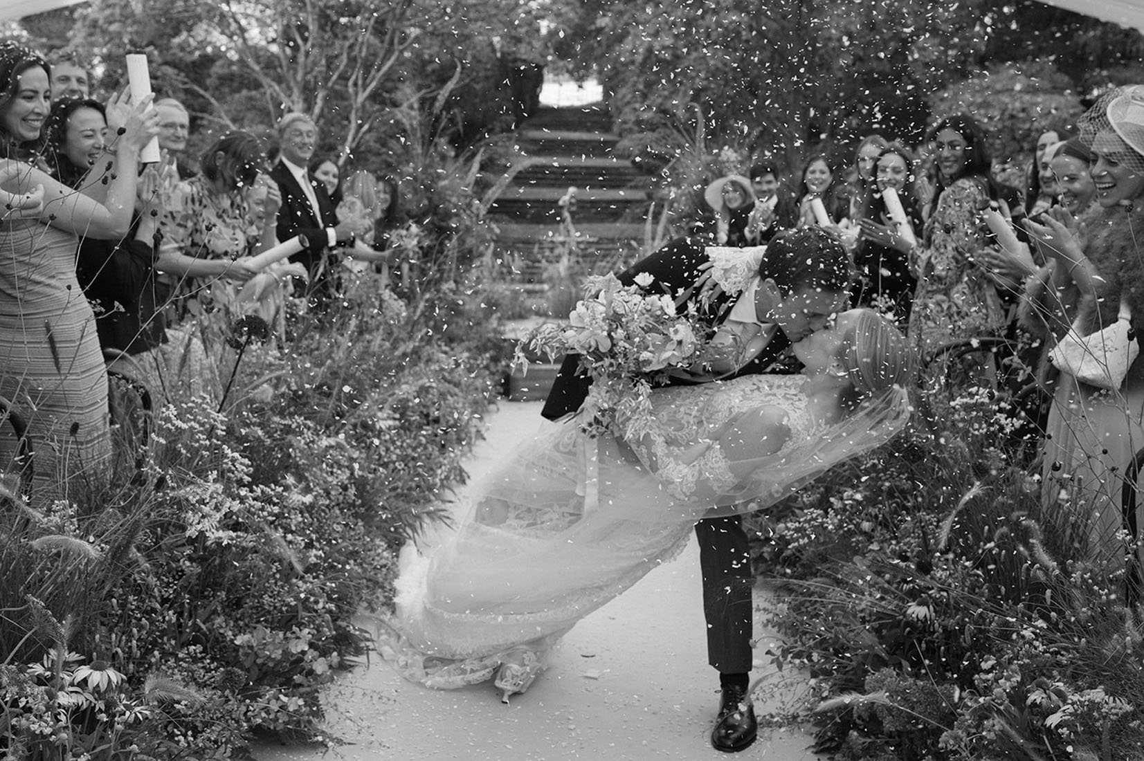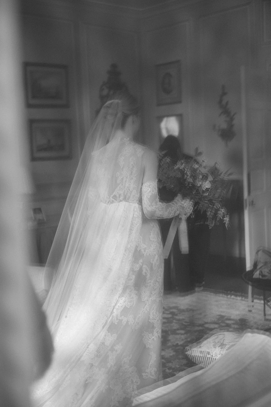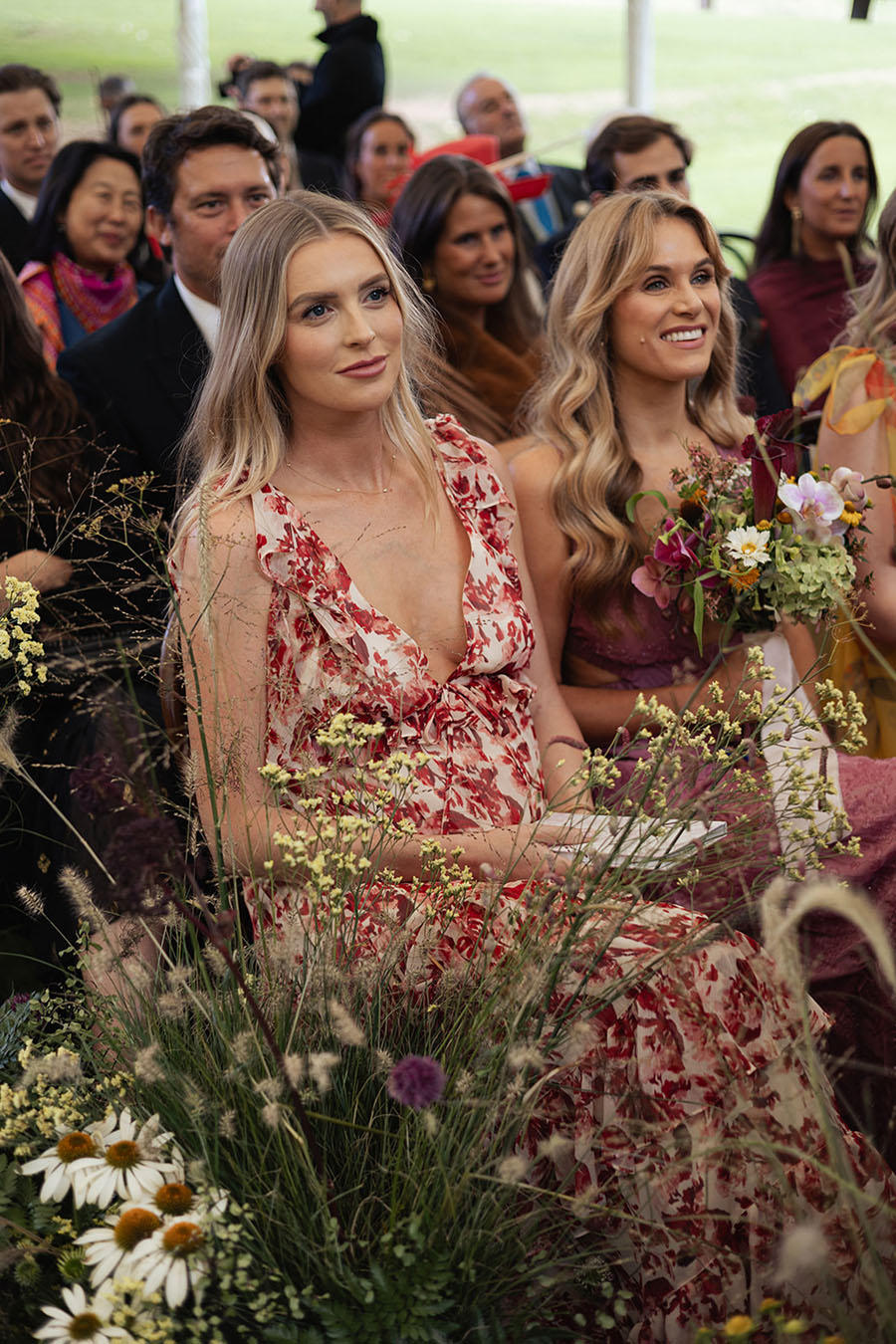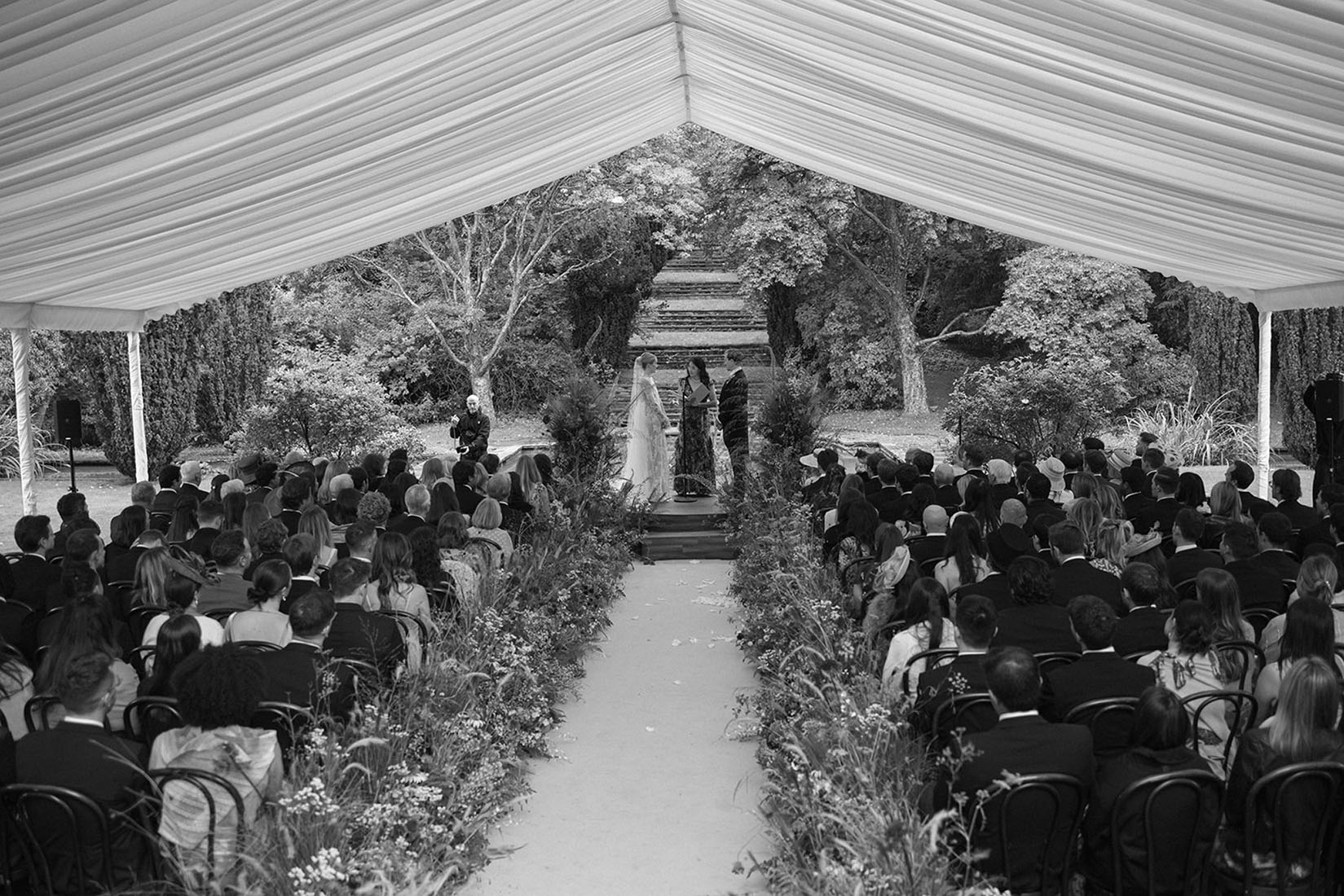 On Saturday, anticipation built through a morning of excitement and laughter as the couple prepared with their nearest and dearest. The ceremony took place in the water garden, framed by the estate’s elegant fountain and tree-lined canals. Beneath a soft, tented canopy, guests watched as the couple exchanged vows on a handcrafted wooden stage, surrounded by wildflower meadows that blurred seamlessly into the landscape beyond.