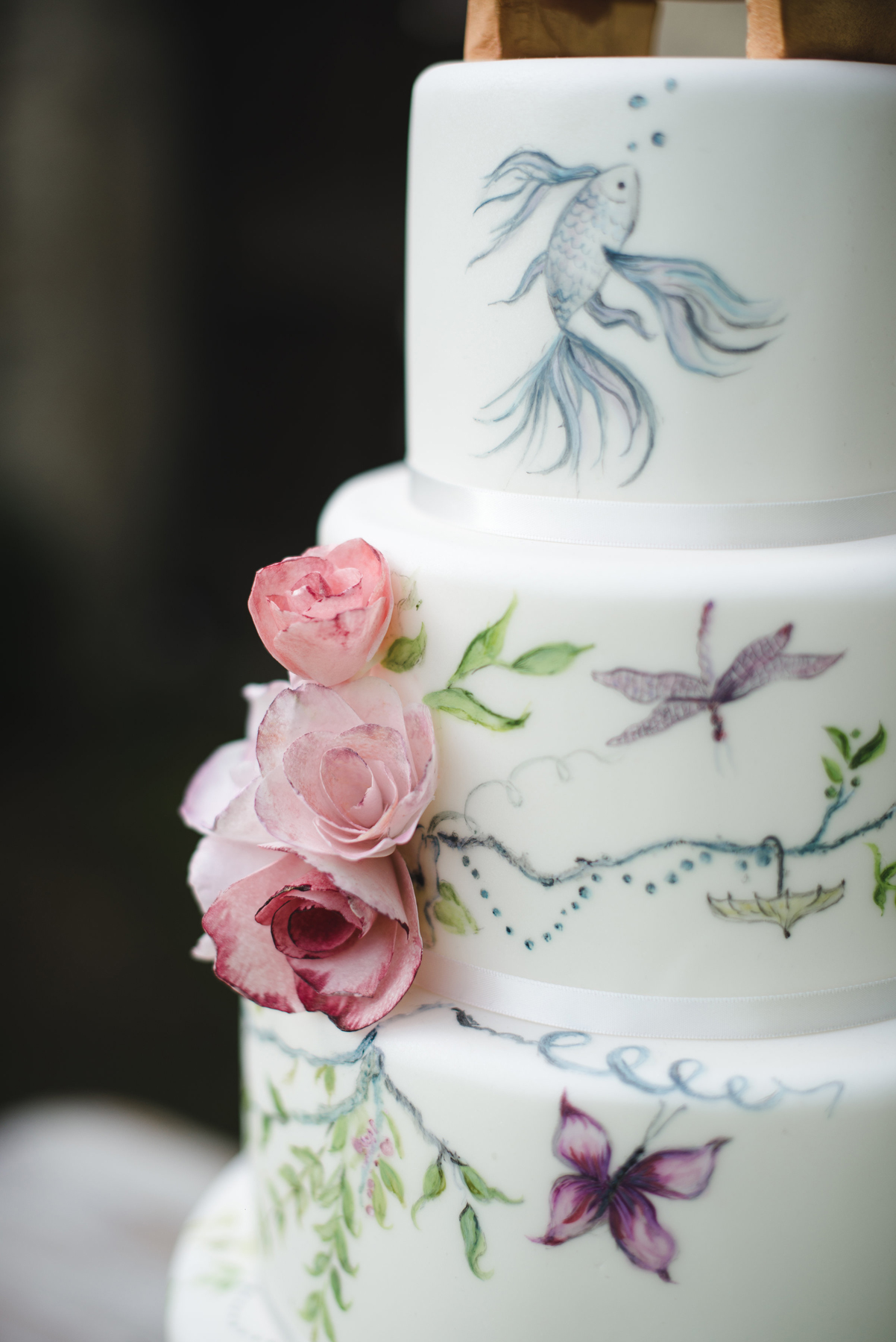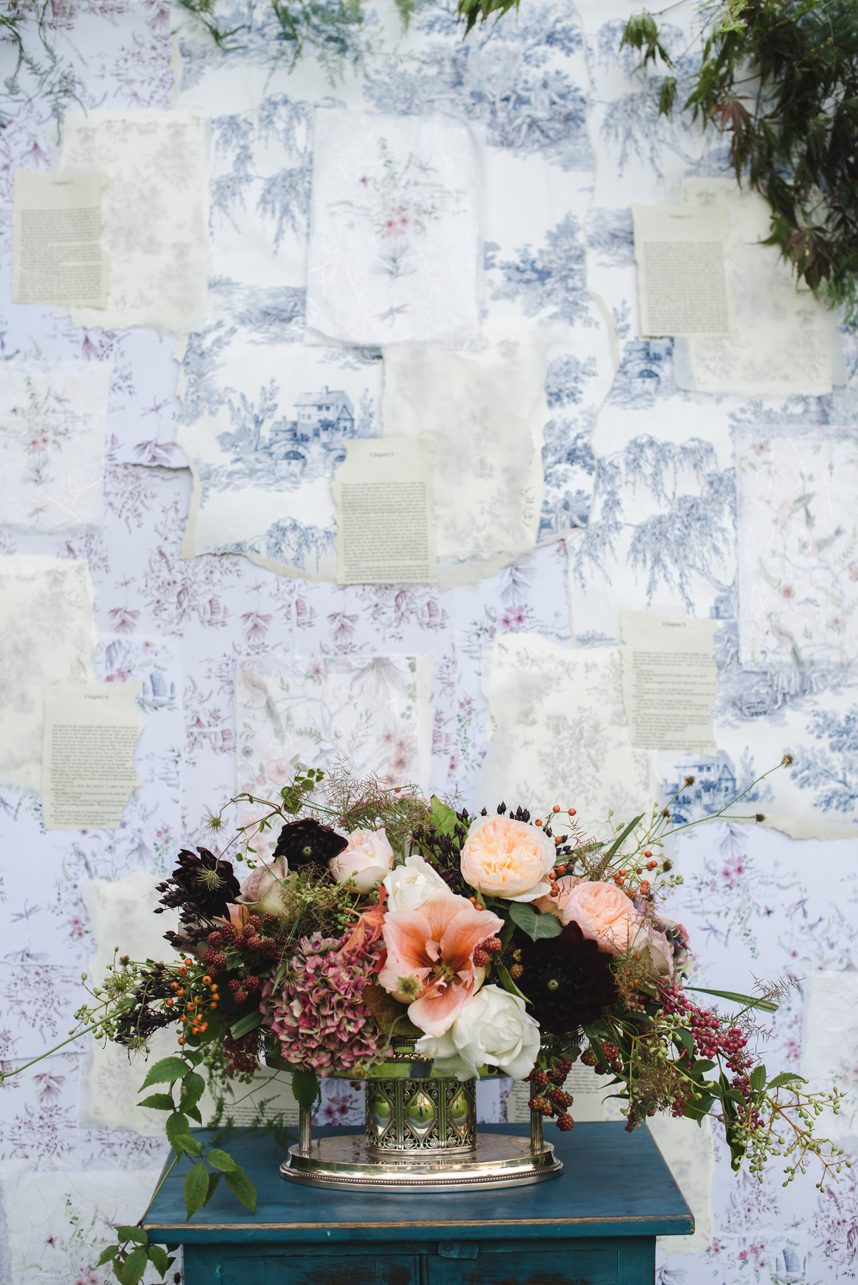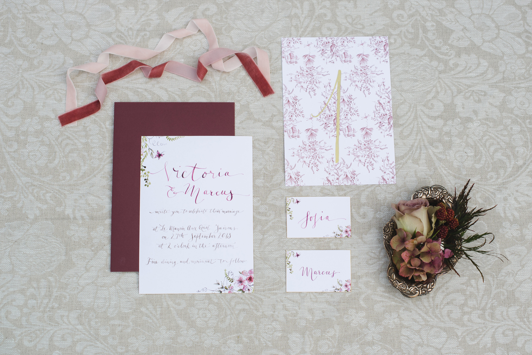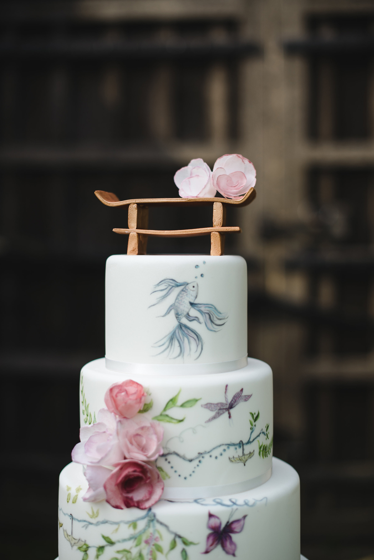 Incorporating subtle eastern-inspired details such as Japanese maple leaf in the florals, oriental birdcages, tassels and pagoda style parasols. We also had a bespoke chinoiserie-style illustration created for us that picked out all these key elements. The colour palette featured a variety of delicate tones alongside richer shades: burgundy, wine, mauve, soft pink and peach adding antique gold and a hint of dusky blue reminiscent of the Chinoiserie style pottery, to convey a real mixture of Eastern and Western stylistic elements.