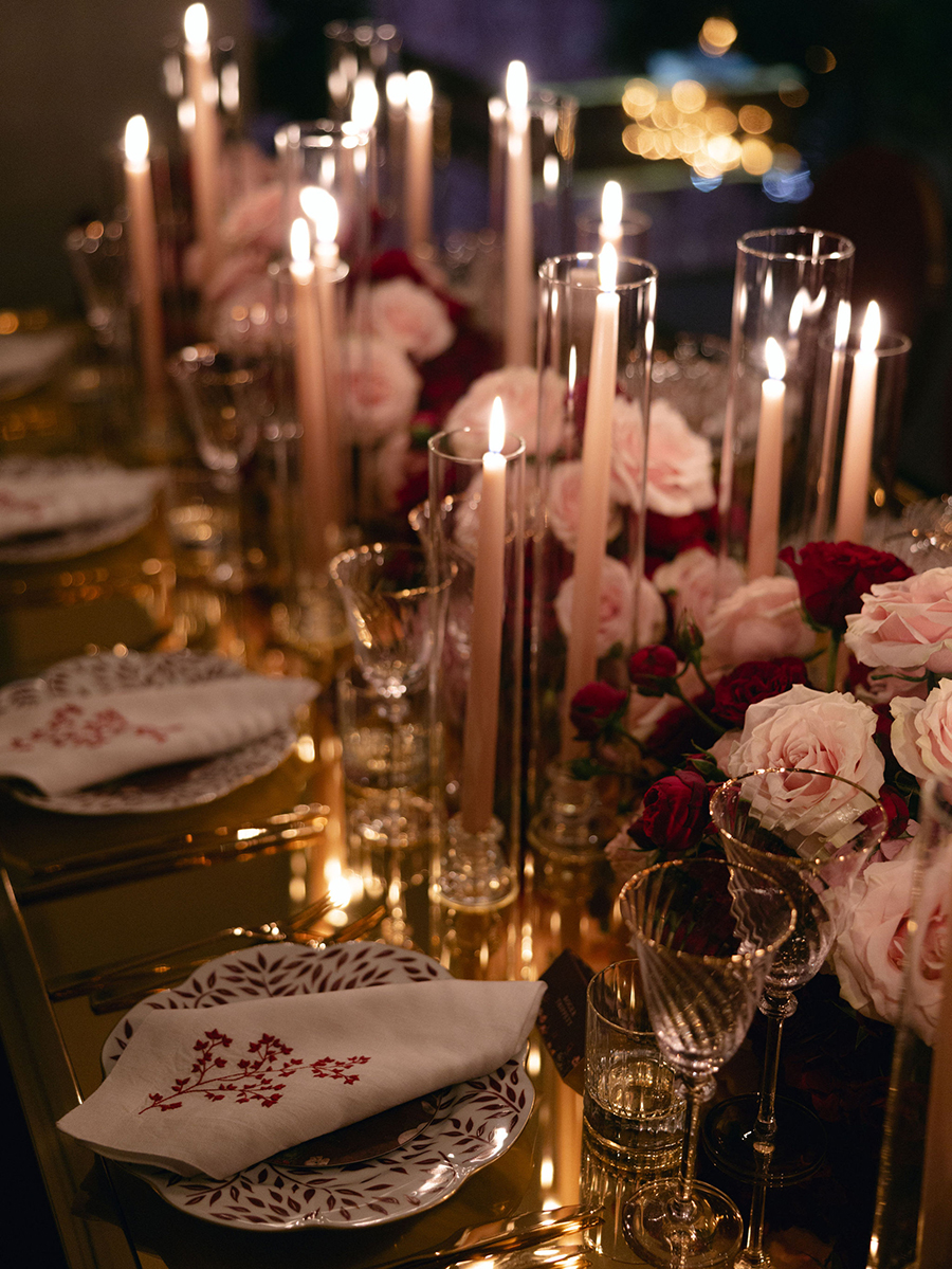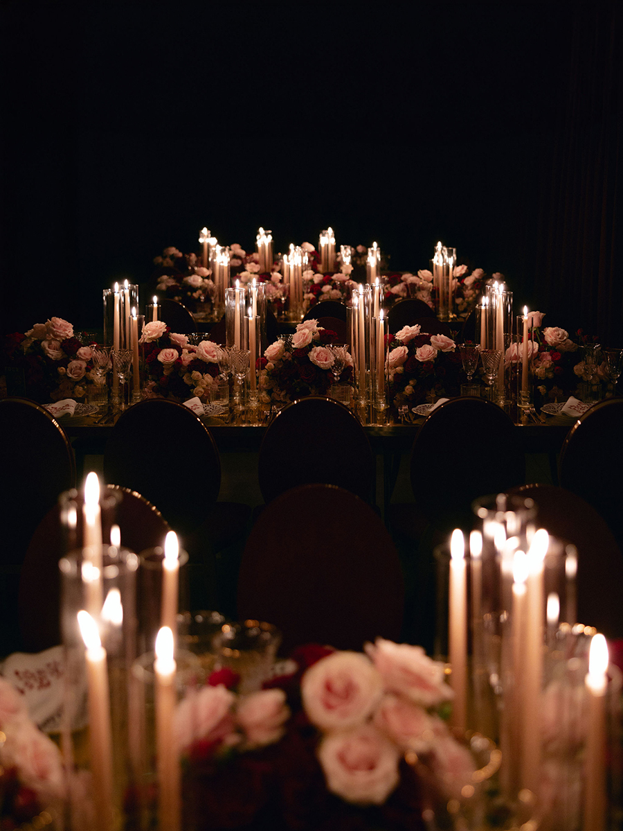 Velvet draping, cascades of crimson florals by Paula Rooney, and glowing candlelight set an indulgent, romantic tone.